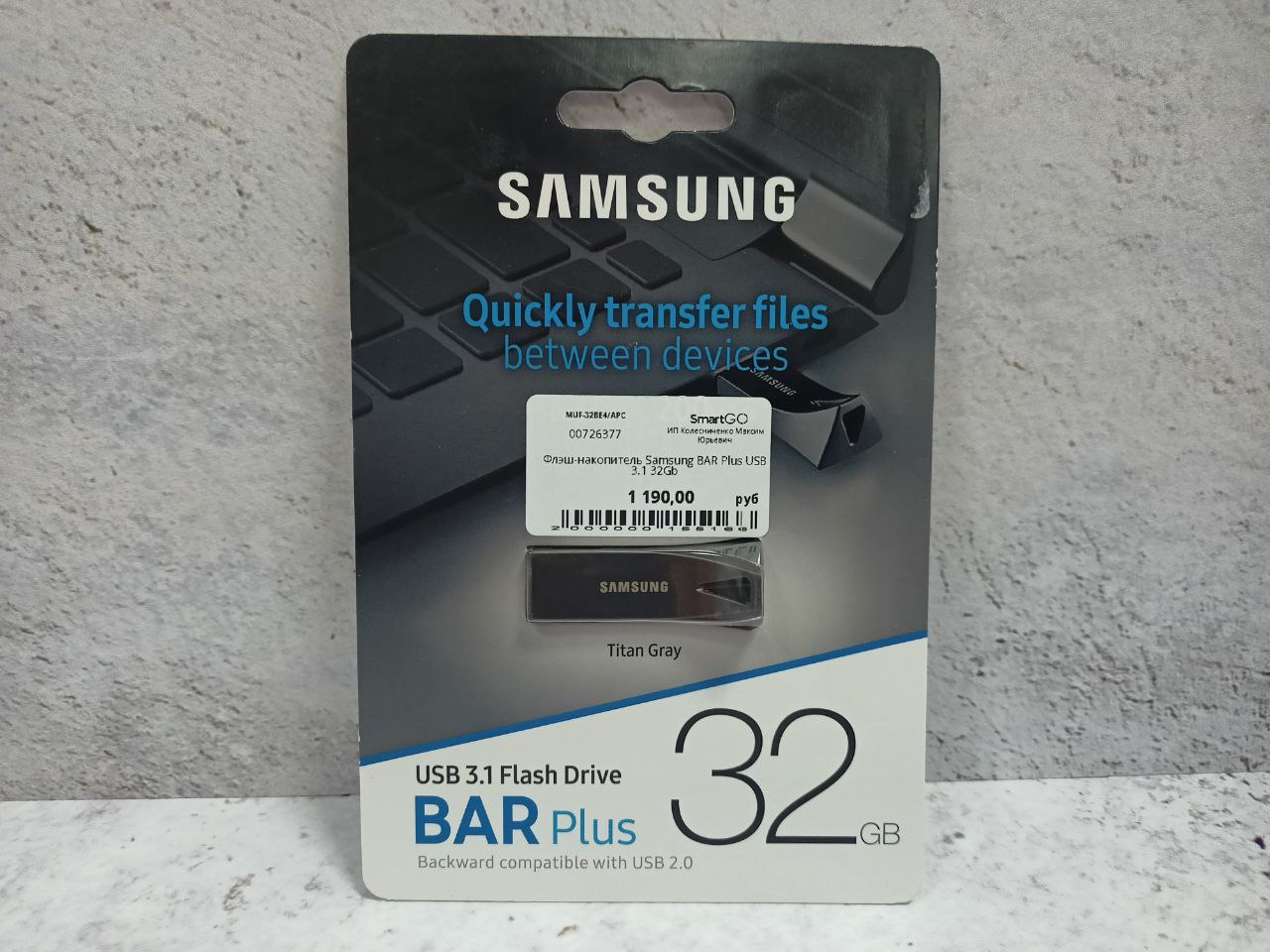 Память USB Flash Samsung BAR Plus [MUF-32BE4/APC] – это надежность, простота применения и высокая скорость работы: скорость записи данных с помощью этого устройства составит 30 Мбайт/сек, чтения - 200 Мбайт/сек. Устройство стандарта USB 3.1 заключено в металлический корпус серого цвета, с отверстием для подвешивания. USB Flash Samsung BAR Plus [MUF-32BE4/APC] – это 32 ГБ объема - достаточно для хранения внушительного архива мультимедиа и ресурсоемких приложений. Компактный аксессуар вы всегда можете взять с собой.